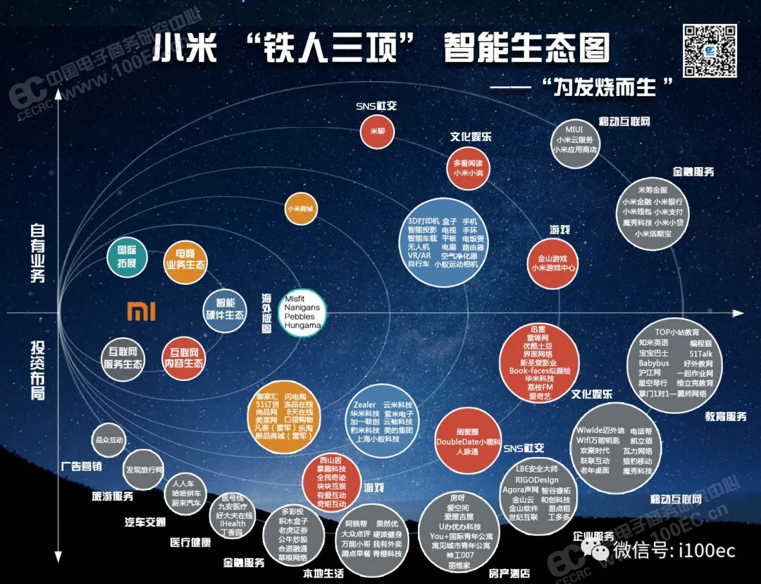 “为发烧而生”的小米“铁人三项”智能生态图分为电商业务生态、智能硬件生态、互联网内容生态、互联网服务生态、国际拓展五部分展开。