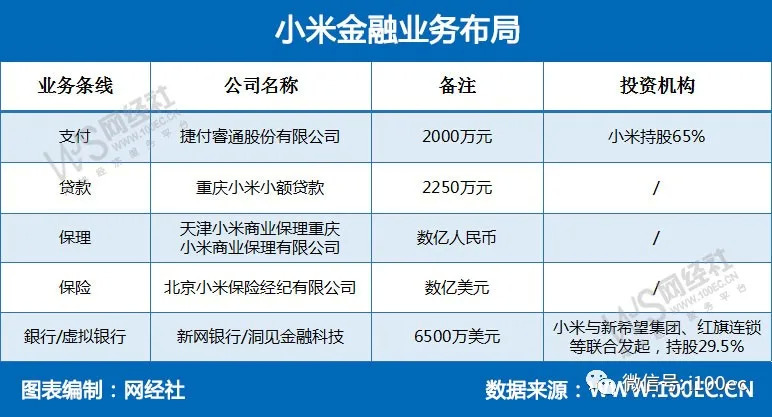虽然小米的金融业务起步并不算早,但是在牌照和业务线布局方面已经相对齐全。目前,小米金融以贷款和第三方支付为核心业务,并拿下保险、保理、银行等多块金融牌照,基本实现全牌照布局。除与新希望等联合发起新网银行外,小米还获得香港虚拟银行牌照。