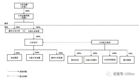 通过小米IPO前的架构可知,小米通过Xiaomi Finance Inc.(开曼)持有小米金融(香港)100%股权,再持有中国境内的重庆市小米小额贷款有限公司(简称“小米小贷”,注册于2015年6月12日,注册资本4.5亿美元,经营范围为——重庆九大区的贷款票据贴现及资产转移;上述业务仅可于该九大区以外的地区线上进行。)和小米商业保理(天津)有限责任公司(简称“小米保理”)各自100%股权。
