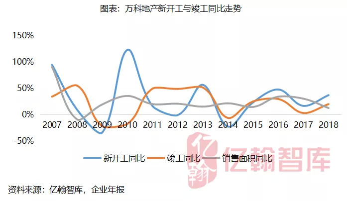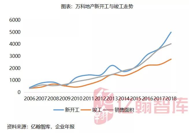 总体上看,2006年至 2018年,万科地产的新开工面积、销售面积与竣工面积走势一致,而且销售面积总量介于新开工面积与竣工面积之间,竣工增速与新开工增速之间存在一定时滞,下行周期内,新开工放缓,竣工增速上行,上行的周期内,新开工和竣工面积同步上涨。