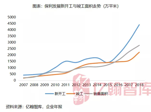 保利发展的新开工面积、销售面积和竣工面积走势一致,2016年开始新开工面积与竣工面积之间的差距放大,2018年两者之间的背离值(背离值=新开工面积-竣工面积)达到历年之最,为2179万平米。2009年至2011年、2016年至2018年竣工面积高于销售面积,2012年至2015年竣工面积低于销售面积。