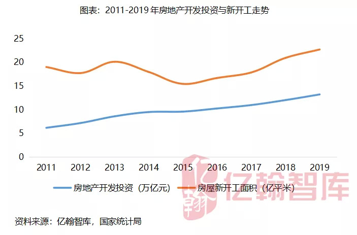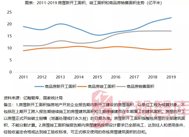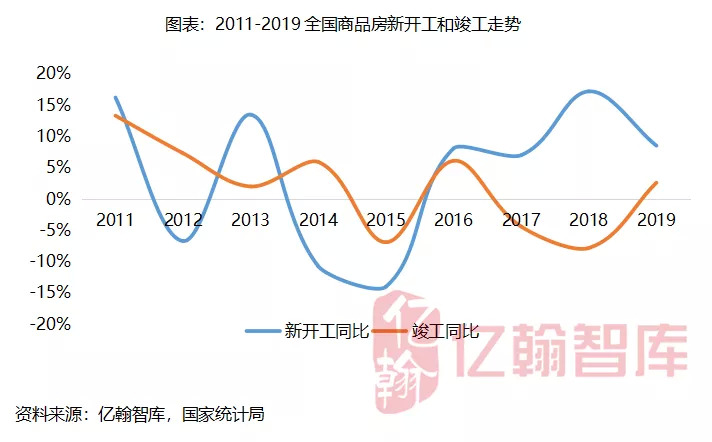 2016年新开工面积与竣工面积同比增速均由负转正,分别为8.1%和6.1%,2017年新开工面积增速虽有所放缓,但仍达到7%,2018年更是陡增至17.2%,而竣工面积相对疲弱,同比增幅连续两年为负,2017年、2018年分别为-4.4%、-7.8%。竣工与新开工增速之间的剪刀差扩大。2019年竣工面积增速由负转正至2.6%,新开工面积增幅收窄至8.5%,两者之间的剪刀差较2018年有明显收窄。
