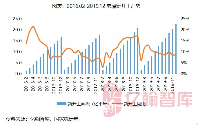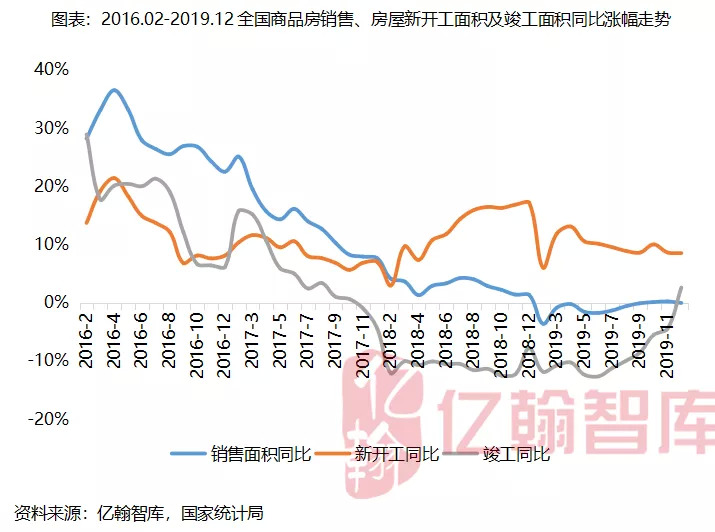 2019年,新开工面积仍然保持快速增长势头,但增速出现明显收缩,至2019年12月为8.5%,主要原因在于由于资金端的压力和土地价格的高企,2018年底开始,企业投资力度明显减弱,由于新开工与土地投资间的时滞,新开工出现增速逐步放缓。