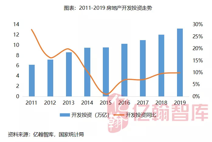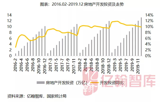 观察历年房地产开发投资数据可以发现,开发投资总量具有一定韧性,未出现过增速为负的情形。2016年开始开发投资增速不断走高,至2018年为9.5%,2019年全年高达9.9%。