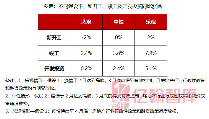以下我们将重点分析中性假设(假设:疫情于2月达到高峰,3月底前得到有效控制,房地产行业行政性政策和融资政策适度放松)下,房屋新开工面积、竣工面积及房地产开发投资变动情况。
