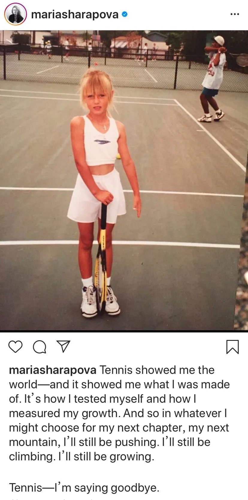 莎拉波娃附上了一张儿时在网球场上的照片,在下面写道,“是网球向我展示了世界,让我认识到我真正的自己。它是我测试自己、衡量自己成长的方式。因此,无论我人生的下一章是什么,下一座高山在哪,我都依旧勇攀高峰、不断成长。网球,我要跟你说再见了。”