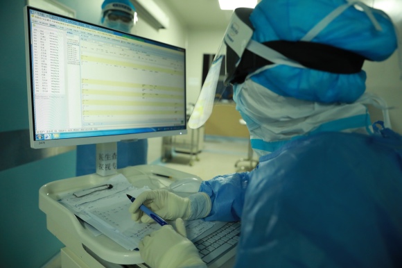 就在护士们为患者翻身时,她的右脚轻轻颤动,随后她慢慢睁开了眼。护士急匆匆叫来了正在门外电脑上查看病历的范学朋。他又凑近看着她,他们四目相对。范学朋明白,这位73岁的患者病情正逐步平稳。而她的病友——隔壁负压病房里57岁的患者,情况也正在好转,新冠肺炎导致的缺氧使她总是无意识地睁眼,护士们便用湿纱布搭住她的双目。