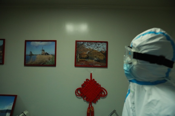 他随后退出了病房。他曾经在交流学习时拍摄过国外的风景,便把照片挂在科室的走廊上。这些来自波士顿、荷兰等地的风景照被他嵌入红色相框内。他穿着防护服路过这些风景时,会抬头看看这些生机勃勃的自然事物。
