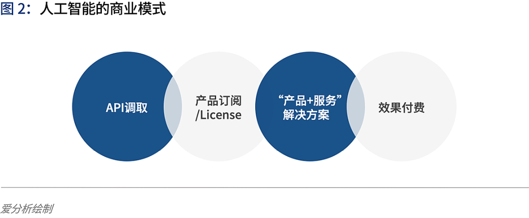 人工智能走向产业应用的过程中,从向企业和个人用户提供人工智能产品服务的角度,人工智能公司的商业模式主要分为四种类型:API调取、产品订阅/License、“产品+服务”解决方案及效果付费。