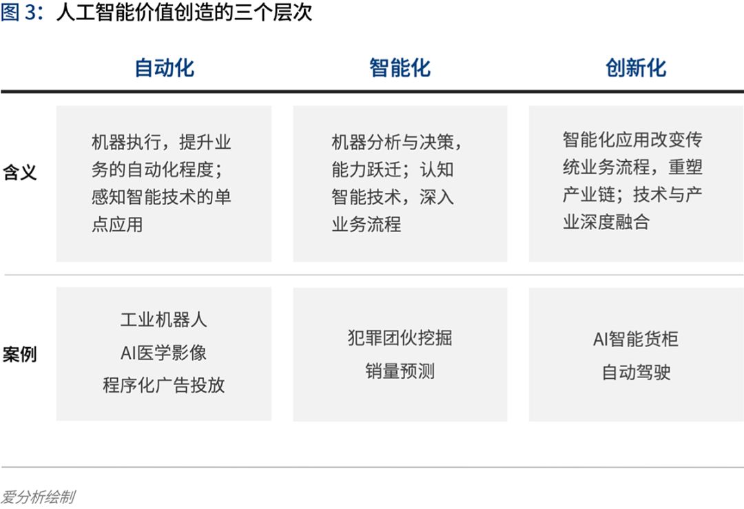 人工智能落地产业带来的价值创造,可以分为自动化、智能化、创新化三个层次,每个层次创造的价值度逐步提升。