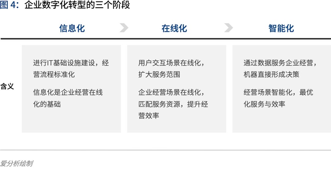 数字化的典型路径分为“信息化——在线化——智能化”三个阶段。信息化即IT基础设施的完善,是企业服务客户和经营管理在线化的基础。在线化包括用户交互场景以及企业经营场景的在线化。智能化是基于在线化沉淀的数据,让企业的经营决策从经验和流程驱动转向数据驱动、自动化决策,实现降本增效。