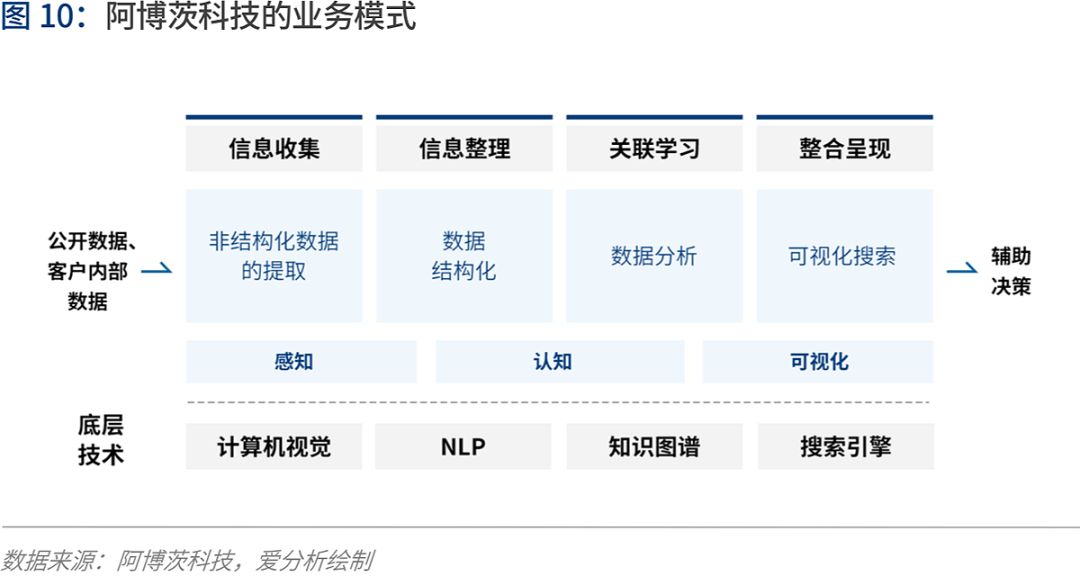 在认知层面,通过自然语言理解的方式在金融领域进行模型训练,帮助AI理解数据内容和意义,再帮助客户把信息导入系统或者Excel中。最后,阿博茨科技再通过可视化搜索引擎向客户展示分析结果。