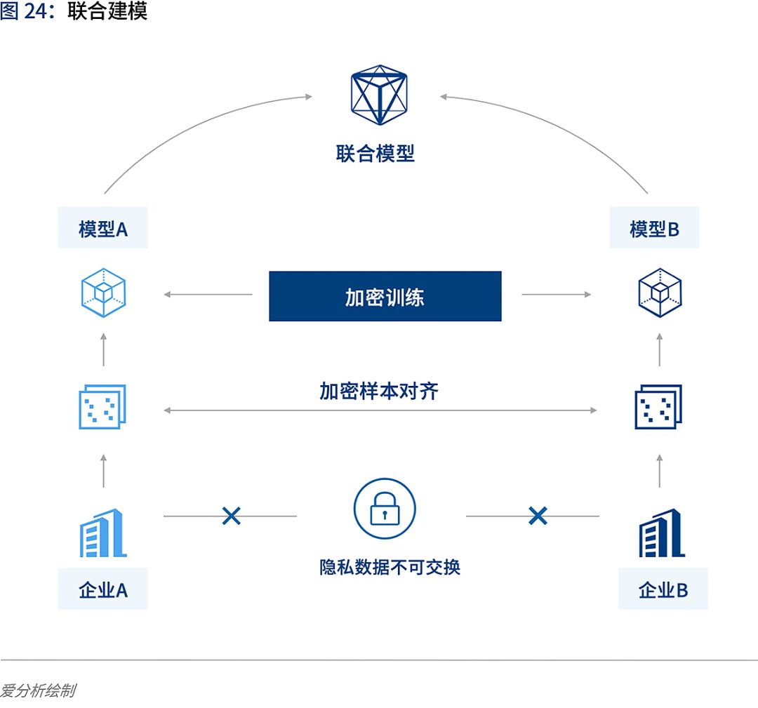 对于数据归属权限制的问题,目前的应对策略之一是采用联邦学习等新技术,在底层数据不进行交换的前提下进行加密训练,可以实现联合建模,并保护数据隐私。