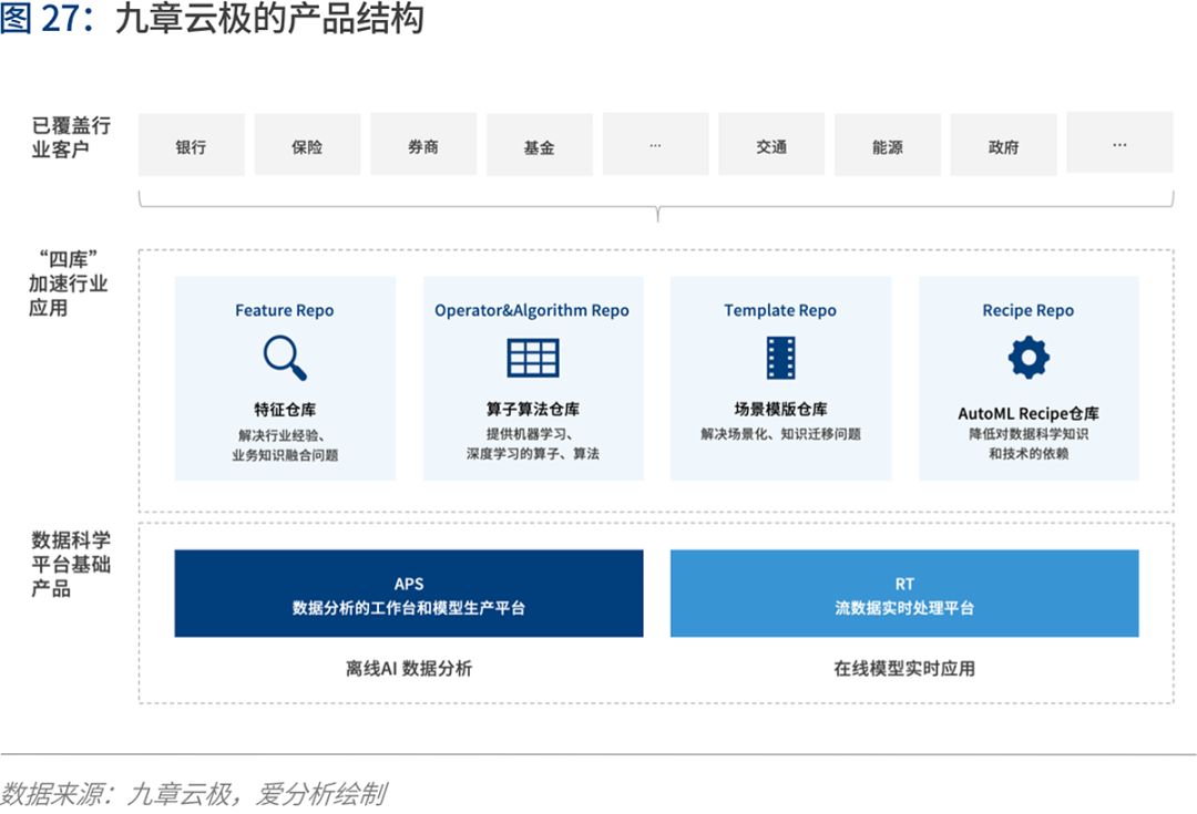 九章的数据科学平台包含了特征仓库、算子仓库、业务场景算法模版仓库和AutoML Recipe仓库。