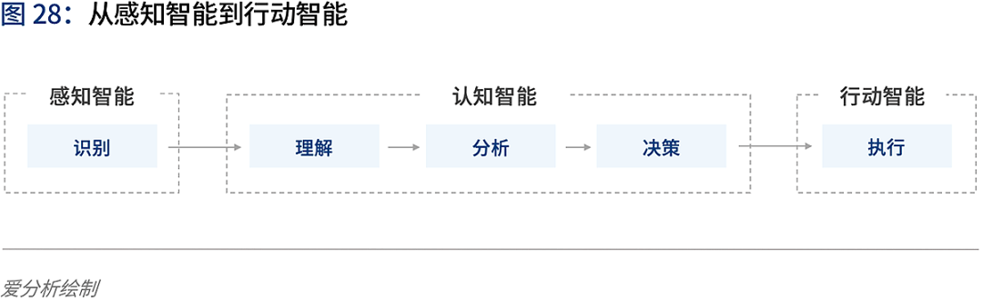 按照解决问题的能力划分,从识别——理解——分析——决策——行动的链条来看,人工智能的发展可以分为三个阶段——感知智能、认知智能和行动智能。