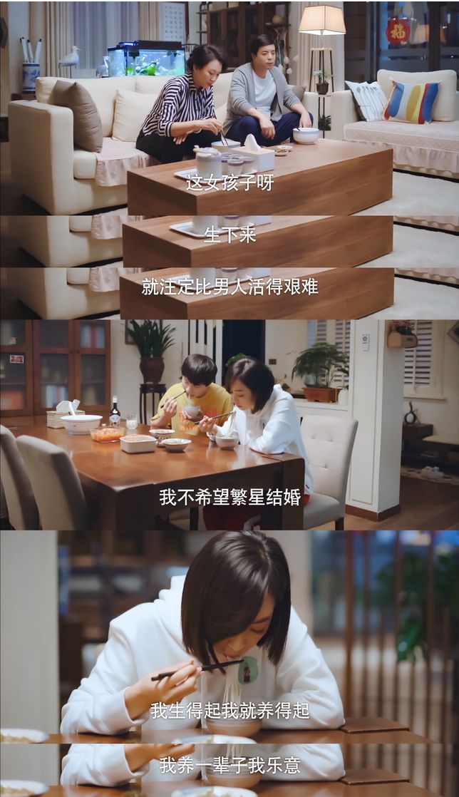 而女主的父母,作为婚姻观和价值观的另一方承载体,也频频贡献金句,展现了和一般影视剧里“恨女不嫁”的父母全然不同的风貌。理解尊重女儿所有的选择,不把大龄未婚女这一事实当作烫手的山芋,只希望女儿能够幸福。