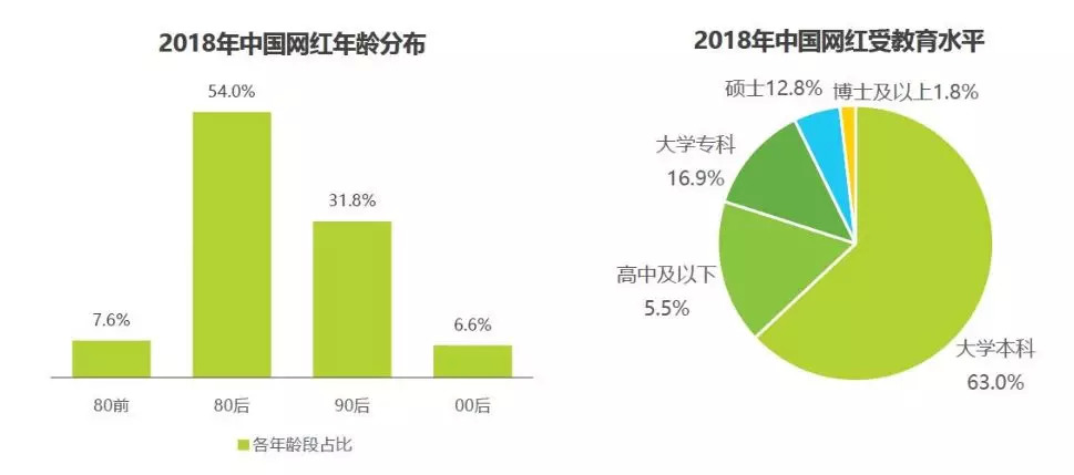 《2018 年中国网红经济发展研究报告》显示,80后微博网红已占总群体的54%,90后占31.8%,网红群体的学历也不断攀升。有本科以上学历的占77.6%,硕士以上学历占13%。