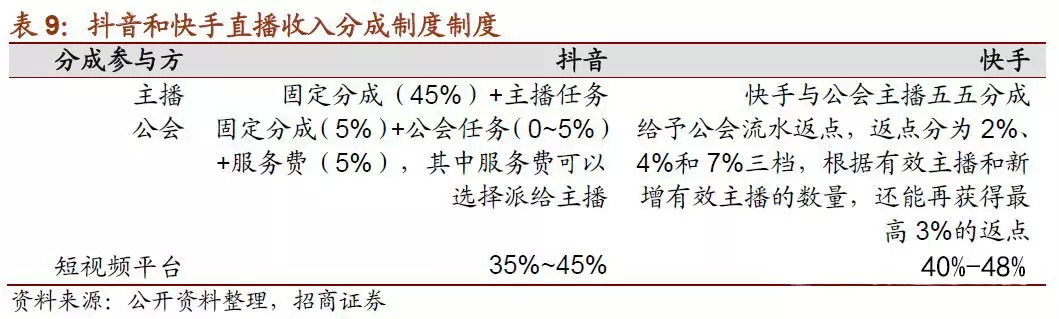 抖音采用的是“固定分成比例+任务奖励”的模式;快手2019年9月宣布成立快手直播公会,采用分级分成制度。