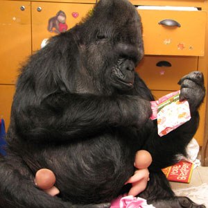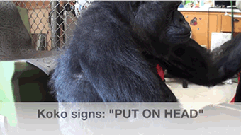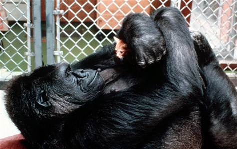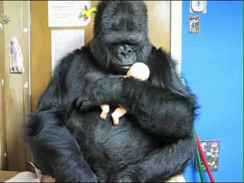 今年已经44岁的Koko在平常生活中比划最多的一个词是“宝宝”。没能拥有自己的小猩猩,Koko只能将小玩偶揽在怀里玩儿扮家家。它甚至通过移动小玩偶的手和胳膊,教它们手语。