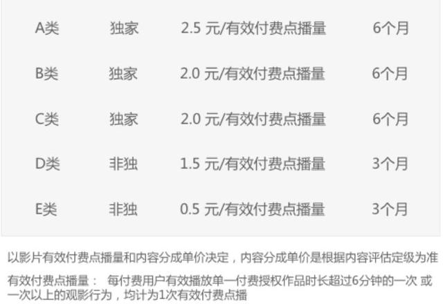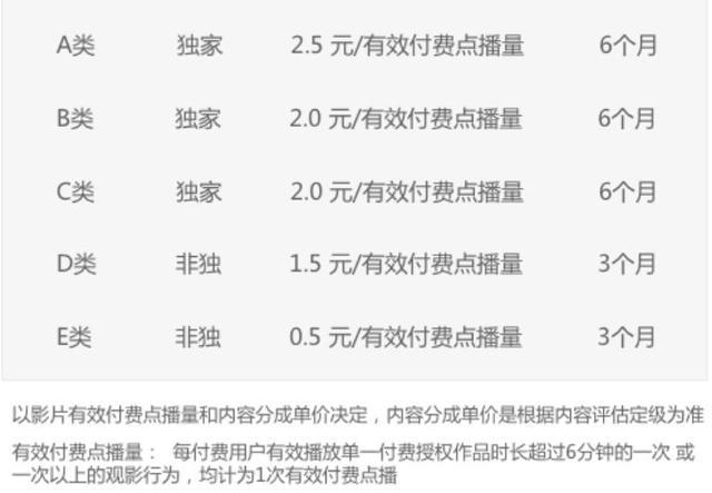分账单价:平台将根据片方提供的成片内容和制作质量综合评定出影片级别,该级别对应的单价即为分账单价。