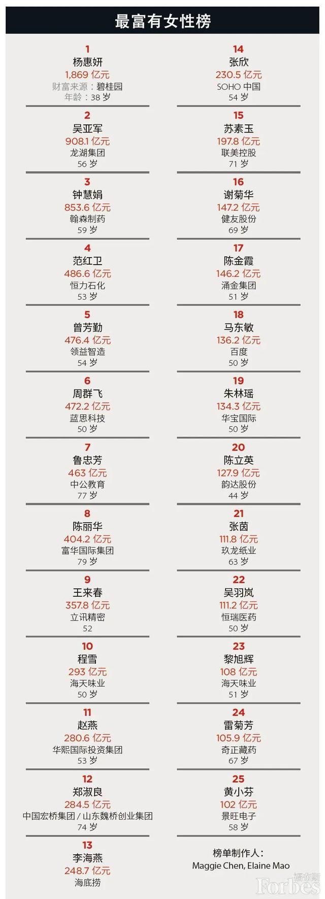福布斯中国2020最富有女性榜