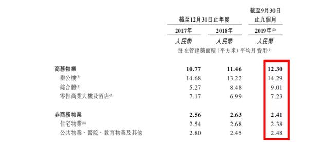 截止2019年9月底,2018年2017年年底,金融街商务物业的物业管理费为12.30元/平方米/月、11.46元/平方米/月、10.77元/平方米/月,呈逐年上升趋势。