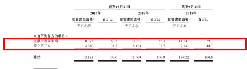 截至2019年9月底,2018年,2017年底金融街物业来自金融街集团的在管建筑面积分别占总在管建筑面积的59.3%、62.3%、63.5%。截至2019年9月底,2018年,2017年底,金融街物业来自独立第三方的在管建筑面积分别占总在管建筑面积的40.7%、37.7%、36.5%。金融街物业尽管对来自独立第三方项目的在管面积占比逐年提升,但增速缓慢。