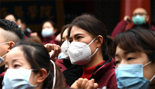 2月1日,在山西新华化工有限责任公司车间,冯雅珍(前中)和女工们在赶制口罩。 新华社记者 马晓媛 摄