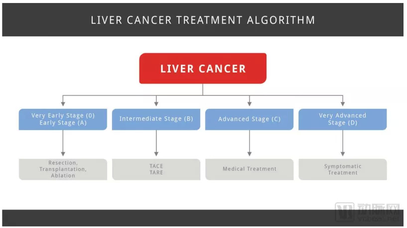 目前肝癌的治疗方法包括了手术、消融、栓塞治疗、放射、靶向治疗、化学疗法和免疫疗法。具体治疗方法取决于肝癌所处的期数。