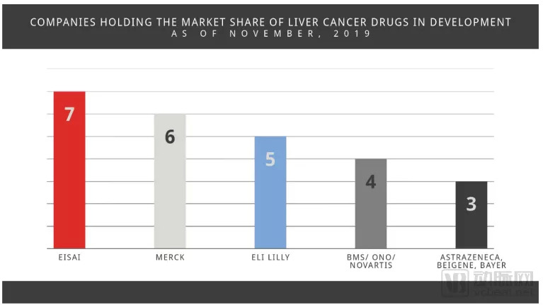肝癌临床试验前五位。注意:本报告并不意味着全面的临床药物实验统计,可能会在无意中排除某些正在开发或临床试验中的药物,尤其是在美国以外的试验。