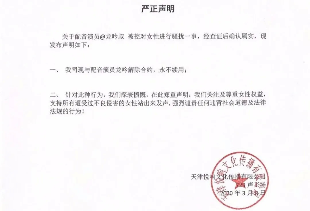 3月8日,知名已婚cv龙吟性骚扰被受害者曝出,龙吟所属公司729声工场迅速调查并核实,三小时内给予公众回复。