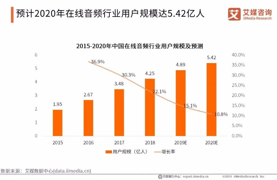 在此基础上,在线音频用户群不断扩大。iiMedia Research(艾媒咨询)显示,2019年,中国在线音频市场用户规模更是达到4.89亿人,预计到2020年将达到5.42亿人。