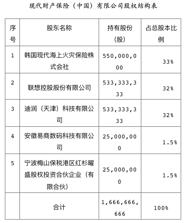 据公开披露内容显示,现代财险控股结构从韩国现代海上火灾保险株式会社100%独资控股变更为五家公司联合控股。