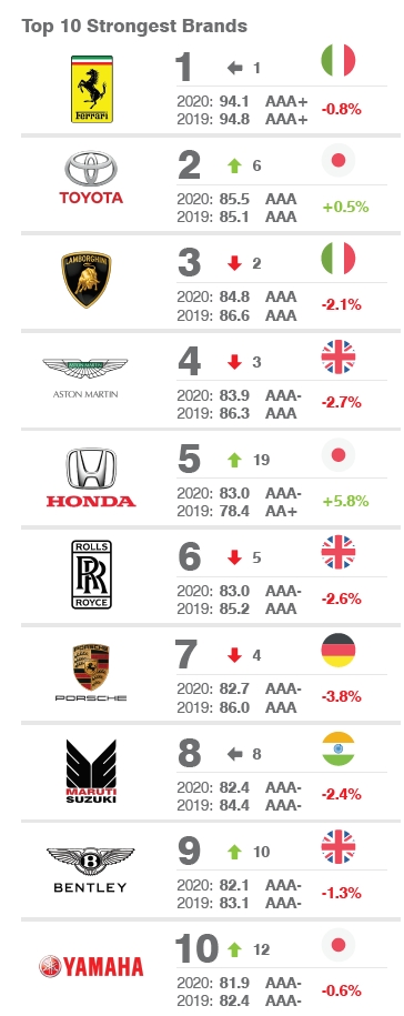 法拉利以94.1分的成绩位居榜首,丰田则已85.5分屈居第2。兰博基尼、阿斯顿马丁和本田则分别以84.8、83.9和83.0位列3-5名。