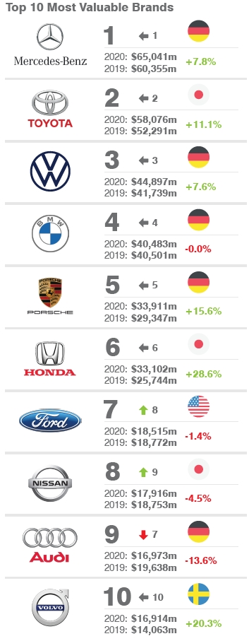 丰田品牌则击败大众品牌,得到了第2的位置。丰田品牌价值为580亿美元,比去年增加了11.1%。这同样得益于近1年多来丰田在电动化、人工智能、自动驾驶领域的频繁投资动作。