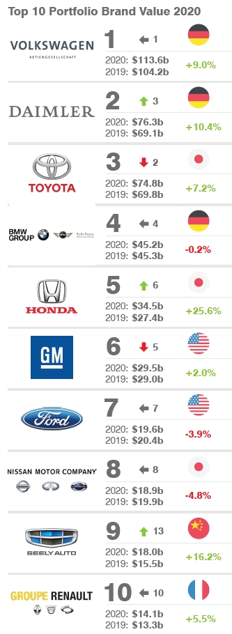 第三个项目为最具价值汽车品牌组合(汽车制造商)。大众集团以1136亿美元价值排名第1,戴姆勒集团和丰田集团分别以763亿美元和748亿美元位列2、3。