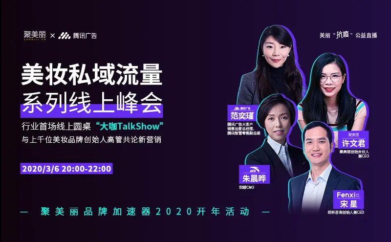 3月6日聚美丽首次美妆私域流量线上峰会,也是化妆品行业内首次多人视频在线的线上圆桌论坛,参与对话的嘉宾为:聚美丽创始合伙人兼CEO许文君,腾讯广告大客户销售运营总经理、腾讯智慧零售副总裁范奕瑾,纷析咨询创始人兼CEO宋星,以及安踏CMO朱晨晔。