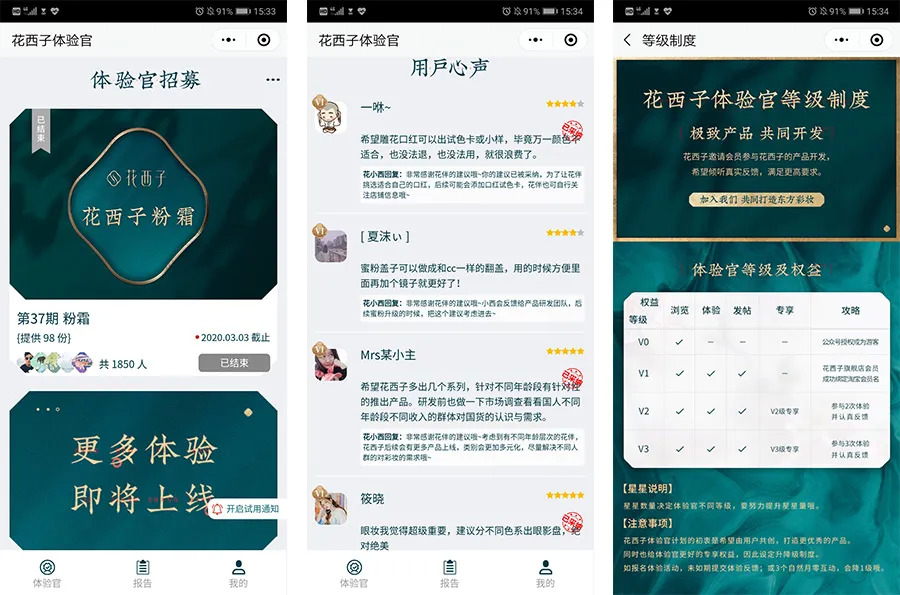 这些私域里的消费者,也可以成为产品的共创者,直接给到品牌对于产品的建议和想法。花西子就有一个产品体验官的小程序,把新开发的样品给一定数量的粉丝试用,然后收集反馈,优化产品。