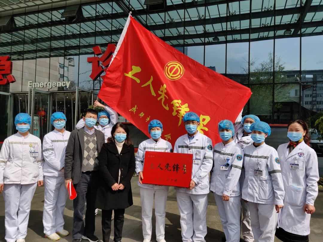 2020年3月11日上午,市总工会党组成员、经审会主任刘锦霞一行4人莅临成都市第二人民医院防控一线慰问,为医院在新冠肺炎抗疫工作中表现突出的急诊科颁发“新冠肺炎疫情防控专项工人先锋号”奖牌。受院党委徐荣华书记委托,党委专职副书记、工会主席欧智勇同志全程陪同。