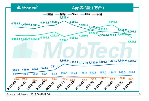 而此次事件的举报对象Uki虽然也为同品类社交产品,但在体量上不足Soul的五分之一。Mob研究院发布的《2019年陌生人社交行业洞察报告》显示,在2019年6月,Soul的App装机量达到1287万,而Uki的装机量仅241万。