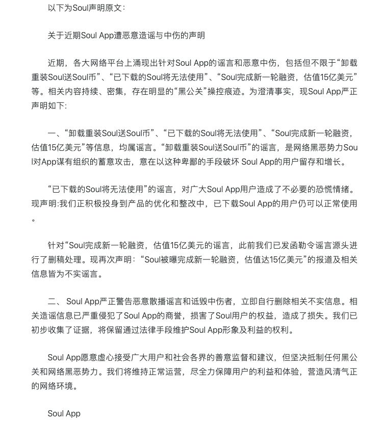巧合的是,2019年7月(也就是李某作案当月),Soul官方渠道对外发布了一封严正声明,指出当时对Soul一系列相关内容持续、密集的报道,存在明显的“黑公关”操控痕迹。声明指出,“Soul App愿意虚心接受广大用户和社会各界的善意监督和建议,但坚决抵制任何黑公关和网络黑恶势力。我们将维持正常运营,尽全力保障用户的利益和体验,营造风清气正的网络环境。”