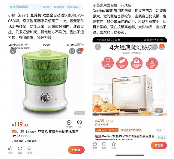 用了两次之后,刘菁将面包机挂上了闲鱼。有那个闲工夫烤面包,早上多睡一会,然后去楼下面包店买一个不更香吗?