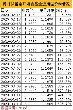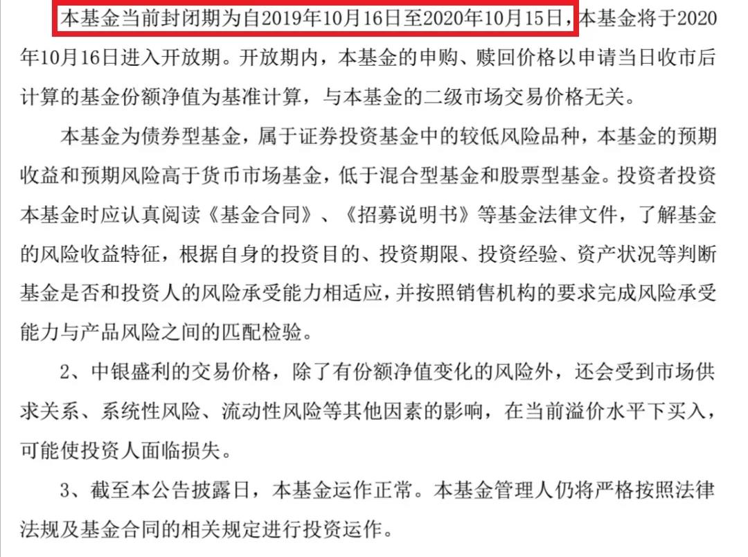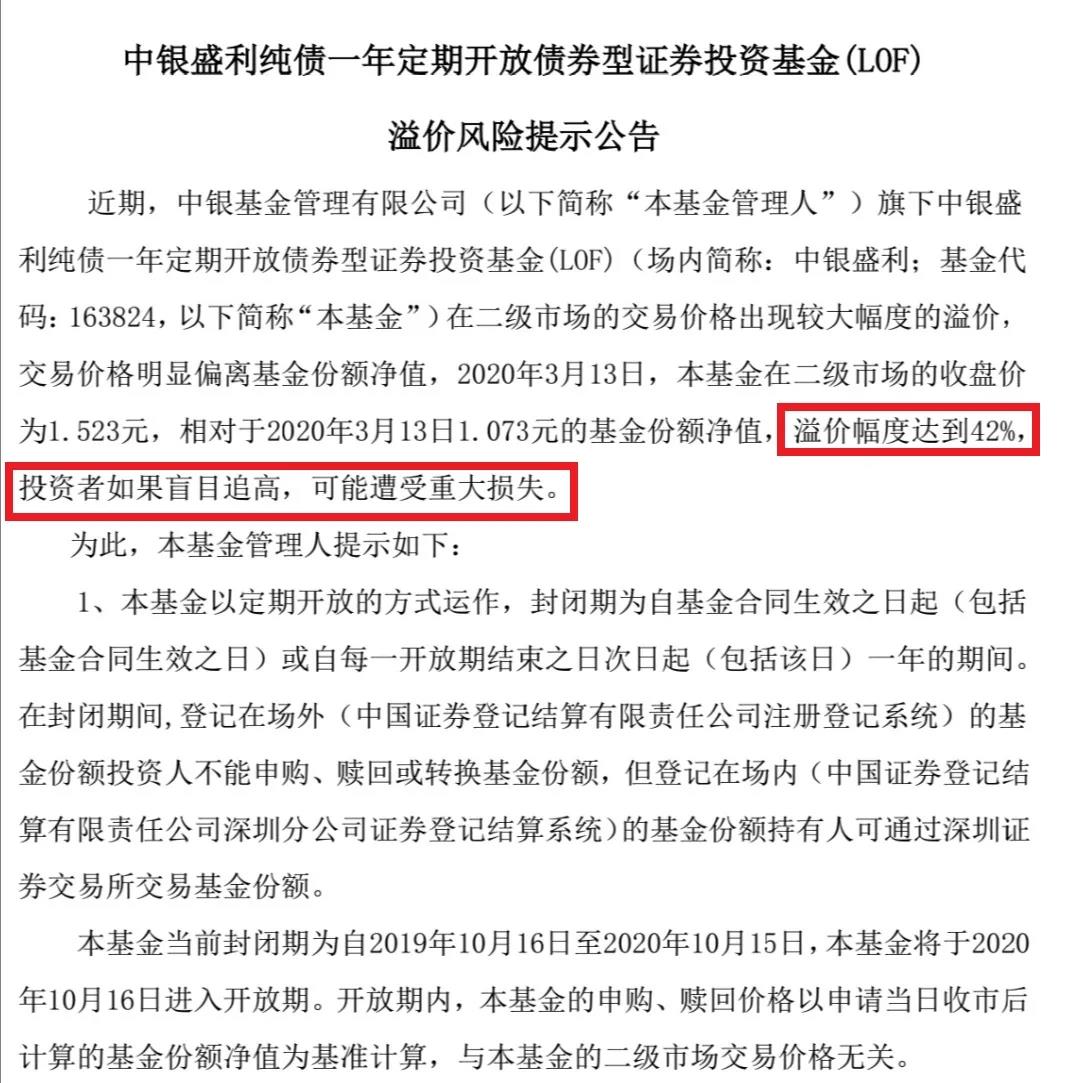 3月14日,中银盛利定开债基金发布溢价风险提示公告。公告称,近期,中银盛利纯债一年定开债基金二级市场的交易价格出现较大幅度的溢价,交易价格明显偏离基金份额净值,2020年3月13日,二级市场收盘价为1.523元,相对于2020年3月13日1.073元的基金份额净值,溢价幅度达到42%,投资者如果盲目追高,可能遭受重大损失。