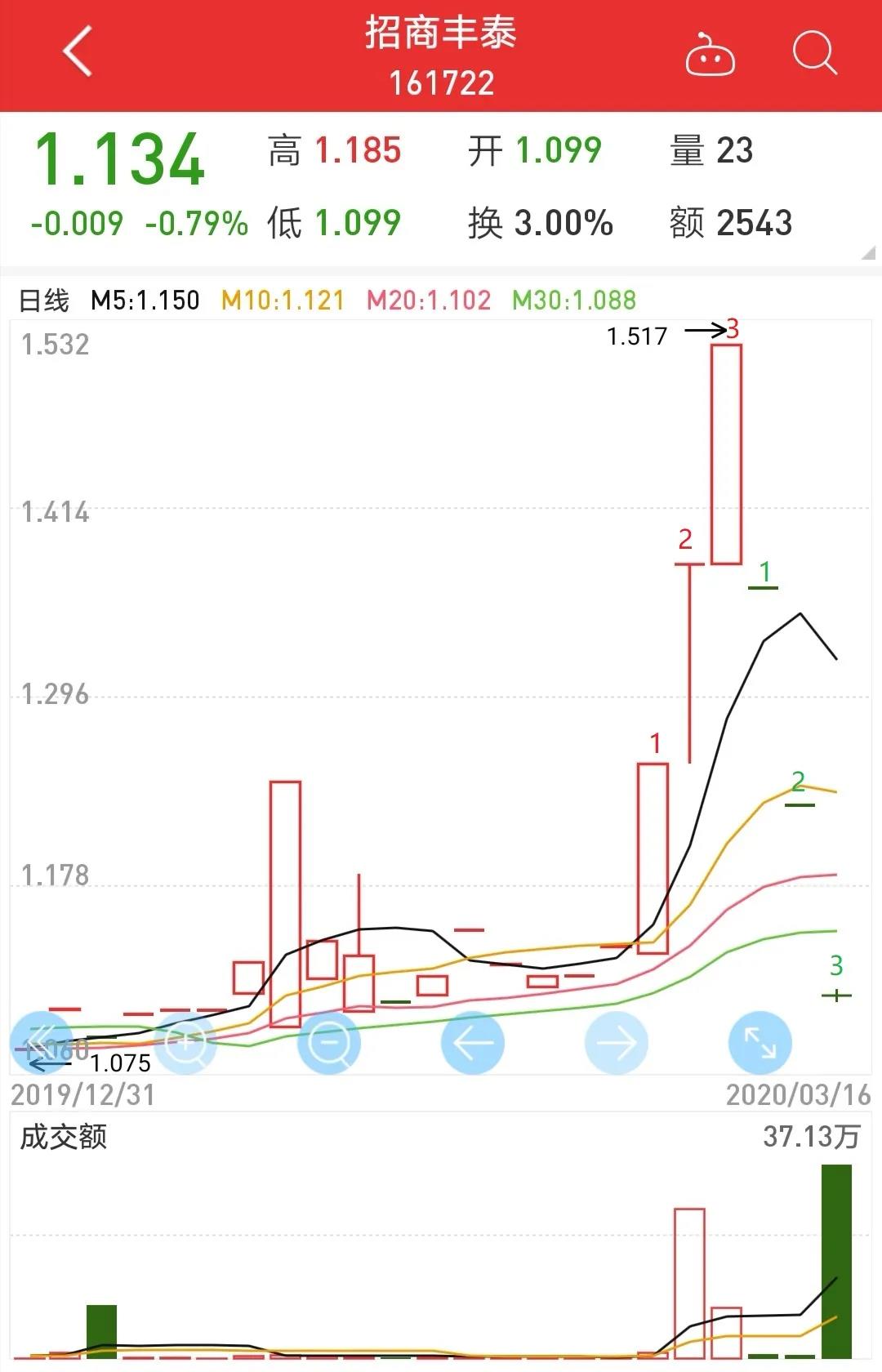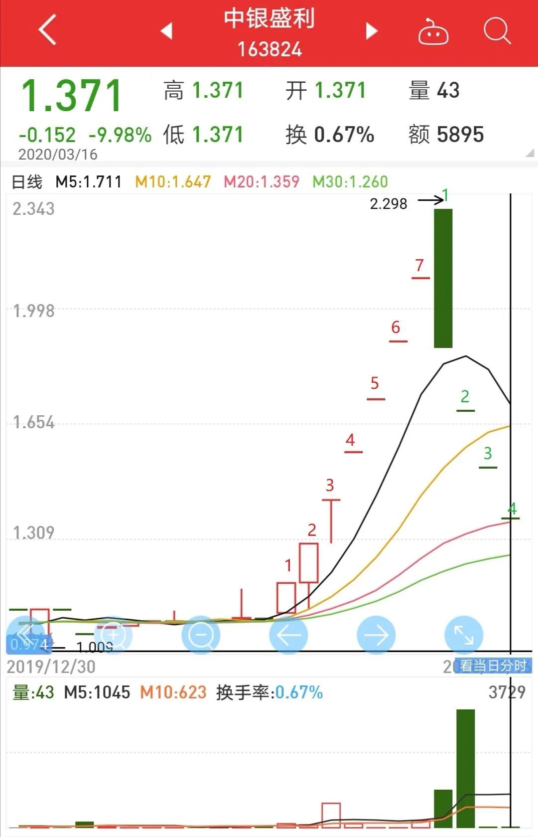 中银盛利从3月2号开始连续7个涨停,3月11号起接连4个跌停,价格从1.555元最高涨到3.288元,3月16号最新收盘价格已经跌回到1.371元。
