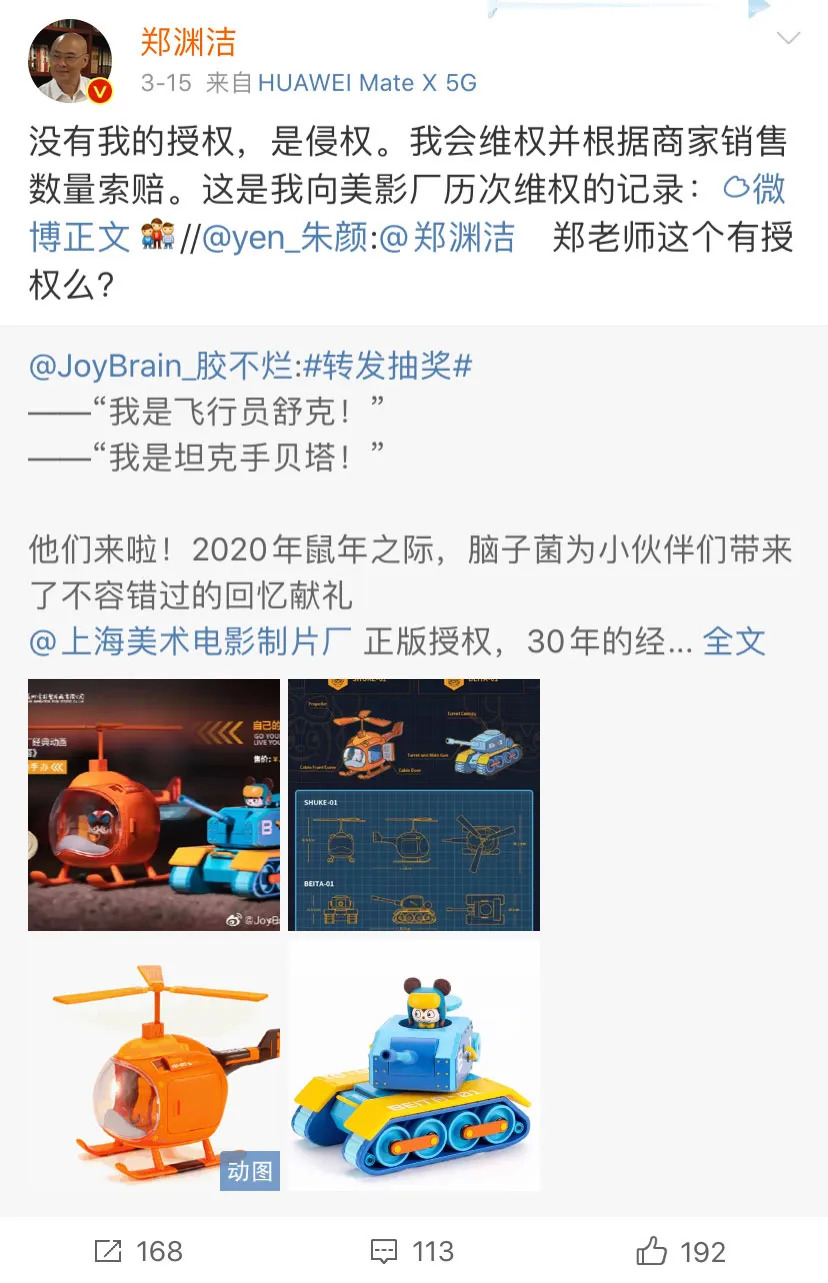 虽然这套玩具号称是由上海美术电影制片厂授权,不过就在该手办发布后2天,《舒克和贝塔》原作者郑渊洁老师就在微博上称,这套产品并没有获得他的授权,并严厉警告了有关商家正在进行的侵权行为。