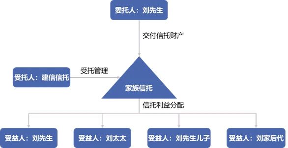 刘先生作为委托人,将其名下的境内财产“装入”境内家族信托,设定妻子、儿子及孙辈作为受益人。由于儿子收到的信托分配均属免税受赠财产,刘先生既可通过家族信托向儿子进行生活、事业等多方面的支持,也无需担心赠与税、遗产税的问题。