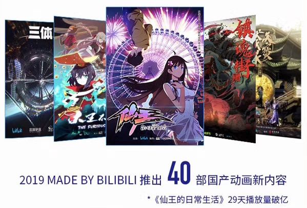 B站在国产动画上投入力度更大。2019年11月,B站举办了第二届MADE BY BILIBILI国创动画作品发布会,推出《天官赐福》《凡人修仙传》《仙王的日常生活》等27部动画新作,并公布了包括《三体》在内的13部新动画的企划。