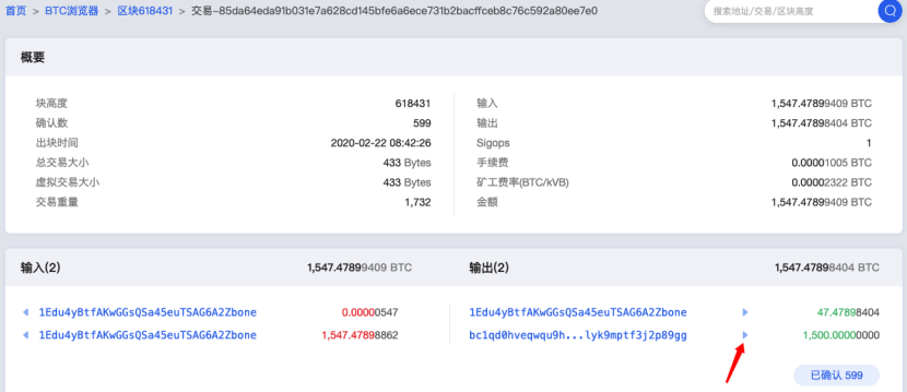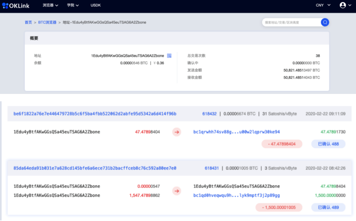 如果是要对某个用户资金的溯源,这个时候我们就需要获取到该用户的比特币账户地址来实现了。比如,2月22日发生的巨鲸账户被盗价值约2.6亿元资产事件,就完全可以利用区块链浏览器来还原真相。通过媒体披露的信息,黑客通过两笔额度为1500个比特币和47个比特币的交易将该巨鲸用户的资产转移。被盗的巨鲸账户比特币地址为:1Edu4yBtfAKwGGsQSa45euTSAG6A2Zbone,打开OKLink区块链浏览器oklink.com,进入BTC区块链浏览器,在搜索栏输入该地址,就可以看到1500个BTC的流向。