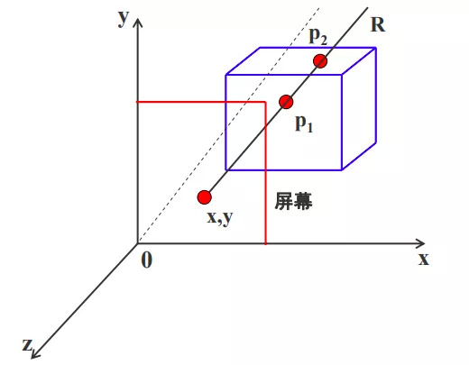 假定 xoy 面为投影面,z 轴为 观察方向,过屏幕上任意像素点(x,y) 作平行于 z 轴的射线 R,与物体表面相交于 p1 和 p2 点,p1 和 p2 点的 z 值称为该点的深度值。
