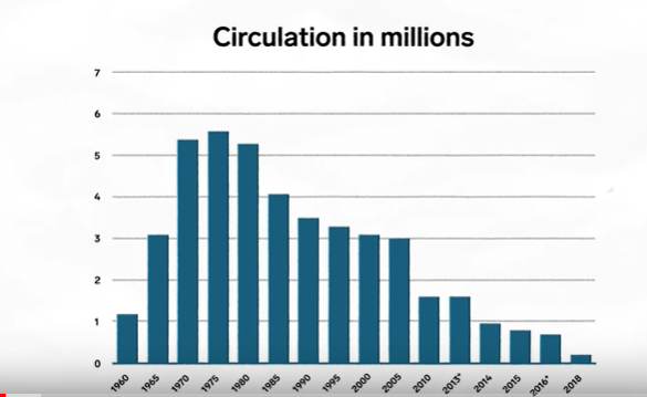 这是一个突然但不意外的消息。与其说新冠肺炎让杂志停刊,倒不如说疫情只是“压死骆驼的最后一根稻草”。在这之前,我们看到《PLAYBOY》纸质版连年下滑的销量,对比1970年代的近700百万册销量巅峰,如今它的销量仅为彼时的4%;我们还看到在数字化媒体的主宰下,曾经的纸媒巨头都在寻求着线上化的发展,而《PLAYBOY》却不幸掉队了。
